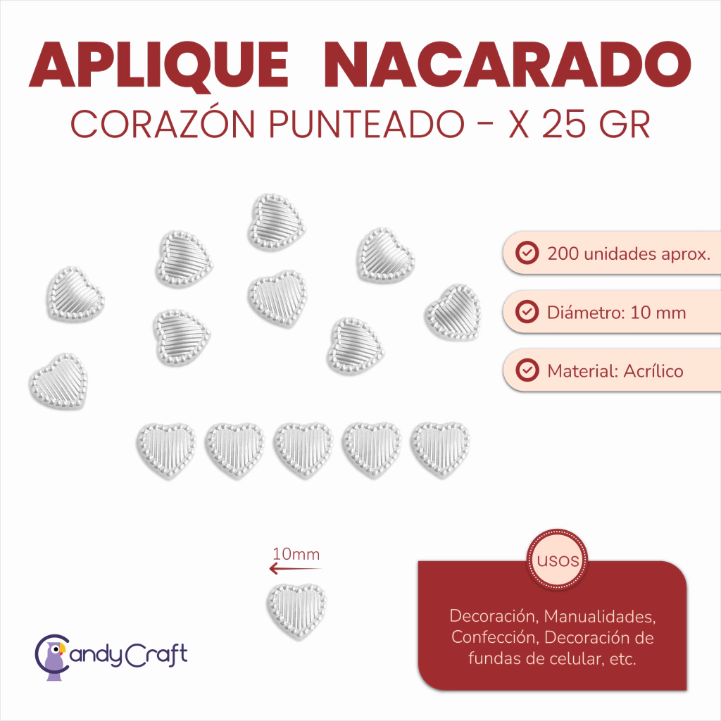 Diámetro: 10mm. Altura: 2mm. Aplique con un lado plano. Cantidad: 1 paquetito de 25 gramos con aprox. 200 unidades. Material: Acrílico. Uso: Decoración, Manualidades,Confección, Decoración de fundas de celular, etc.