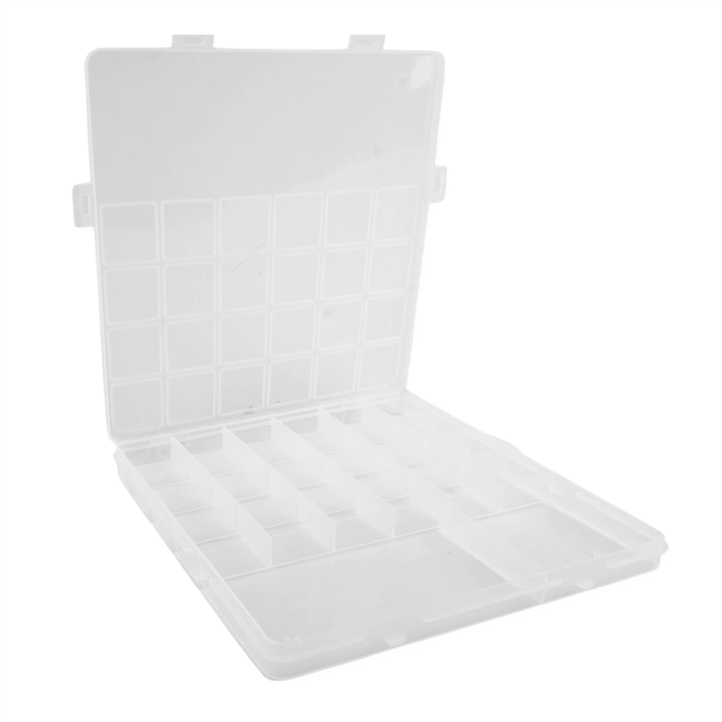 Ancho: 20cm. Largo: 19cm. Profundidad: 1,5 cm. Contiene 26 divisiones: 24 divisiones de 3x3cm, 1 división de 6,7x6,7cm y 1 división de 11,2x6,7cm. Maletin plastico de pvc de excelente calidad liviana con tapa bisagra transparente y contenedor transparente. Uso: Es una excelente para guardar articulos como perlas, cuentas, hilos, agujas, argollas, mosquetones, mostacillas, aros, pulseras, collares y muchos mas.