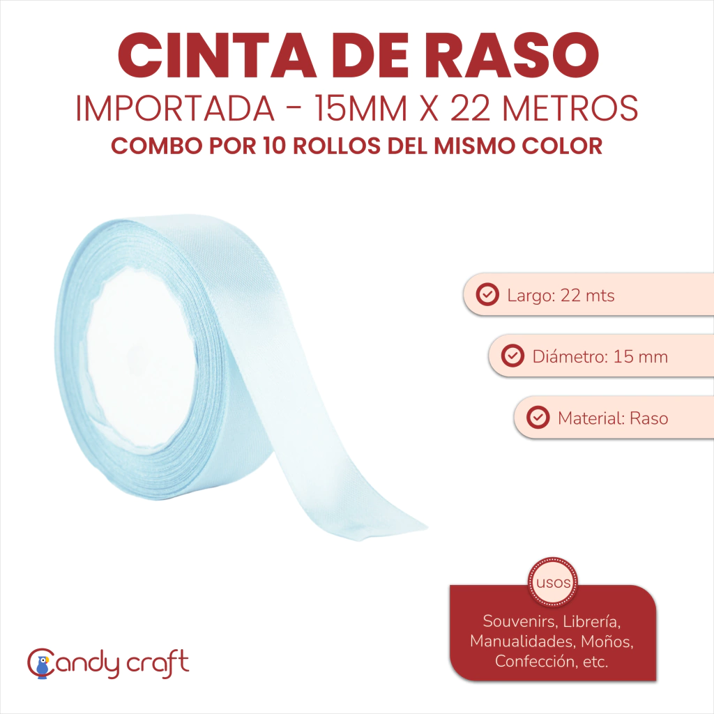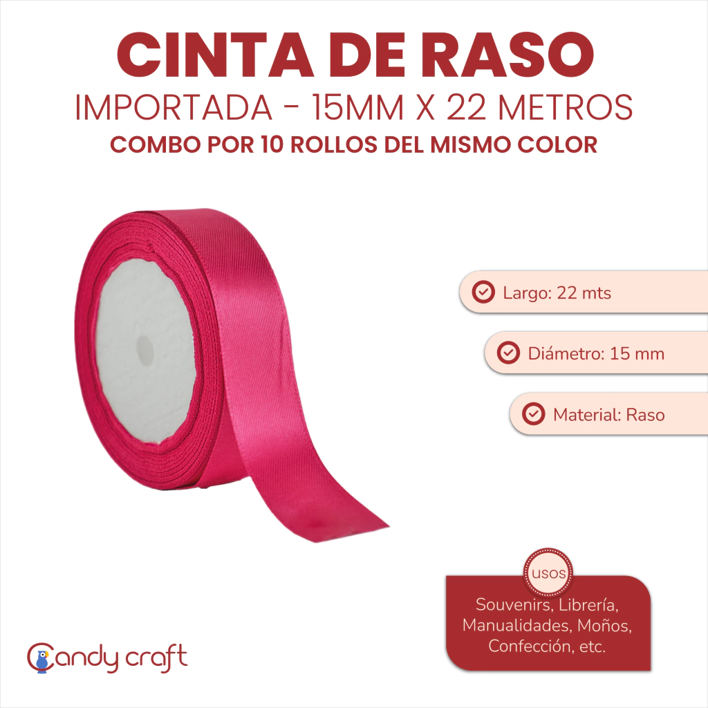 Medida Ancho: 15 mm. Largo: 22 metros. Cantidad: 10 rollos del mismo color. Material: Raso. Uso: Souvenirs, Librería, Manualidades, Moños, Confección, etc.