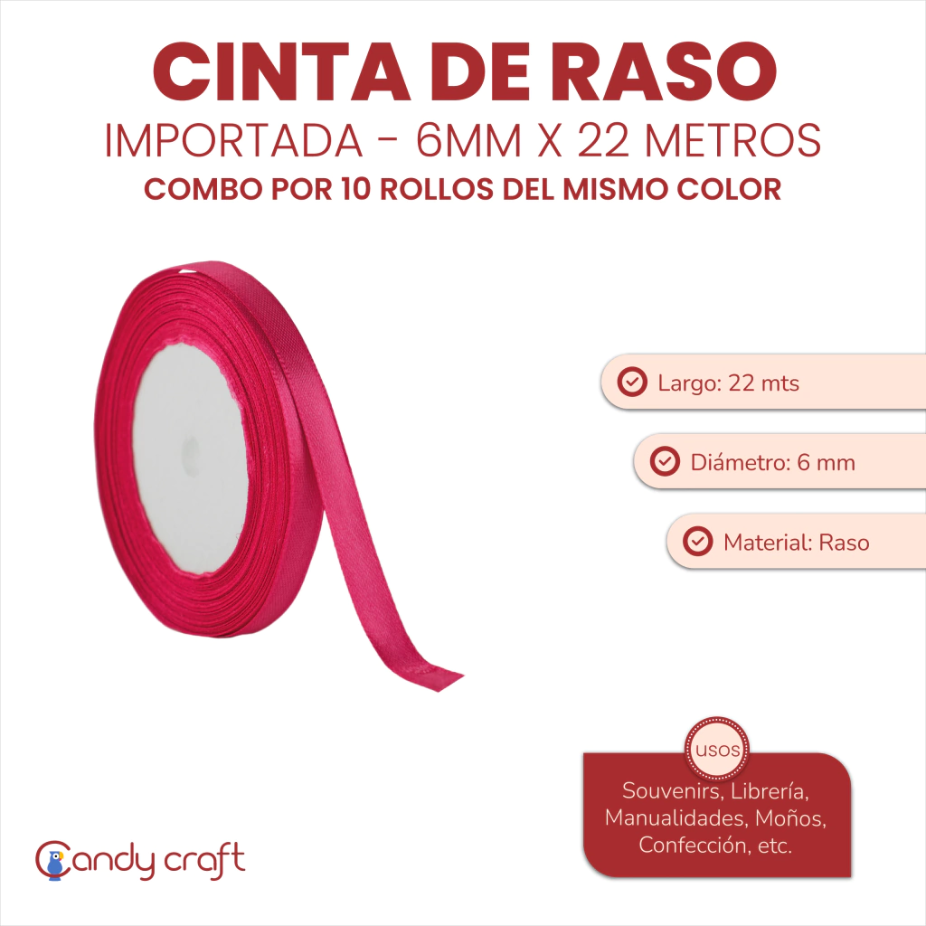 Medida Ancho: 6 mm. Largo: 22 metros. Cantidad: 10 rollos del mismo color. Material: Raso. Uso: Souvenirs, Librería, Manualidades, Moños, Confección, etc.