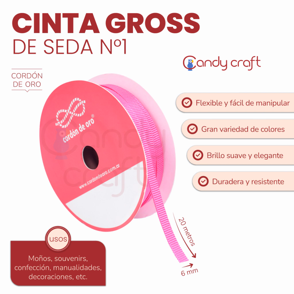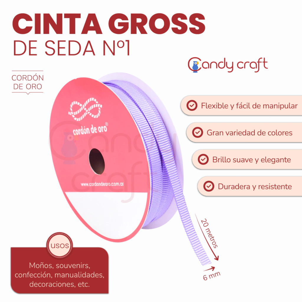 Medida Largo: 20 metros Ancho: 6 mm Marca: Cordón de Oro Material: Gross de Seda