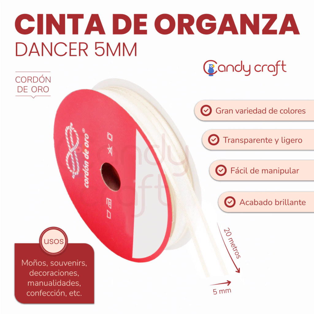Medida Largo: 20 metros Ancho: 5 mm Marca: Cordón de Oro Material: Organza con Raso Uso: Souvenirs, Librería, Manualidades, Moños, Confección