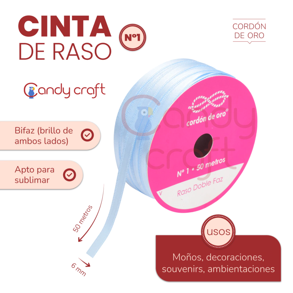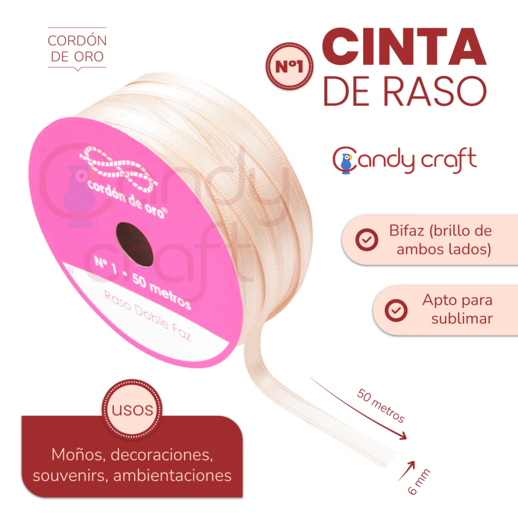 Medida Largo: 50 metros Ancho: 6 mm Marca: Cordón de Oro Material: Raso Uso: Souvenirs, Librería, Manualidades, Moños, Confección