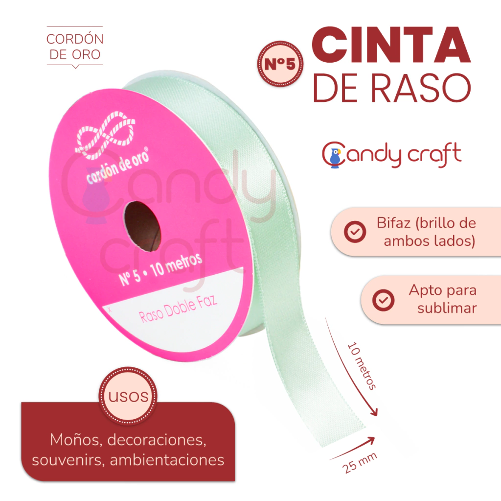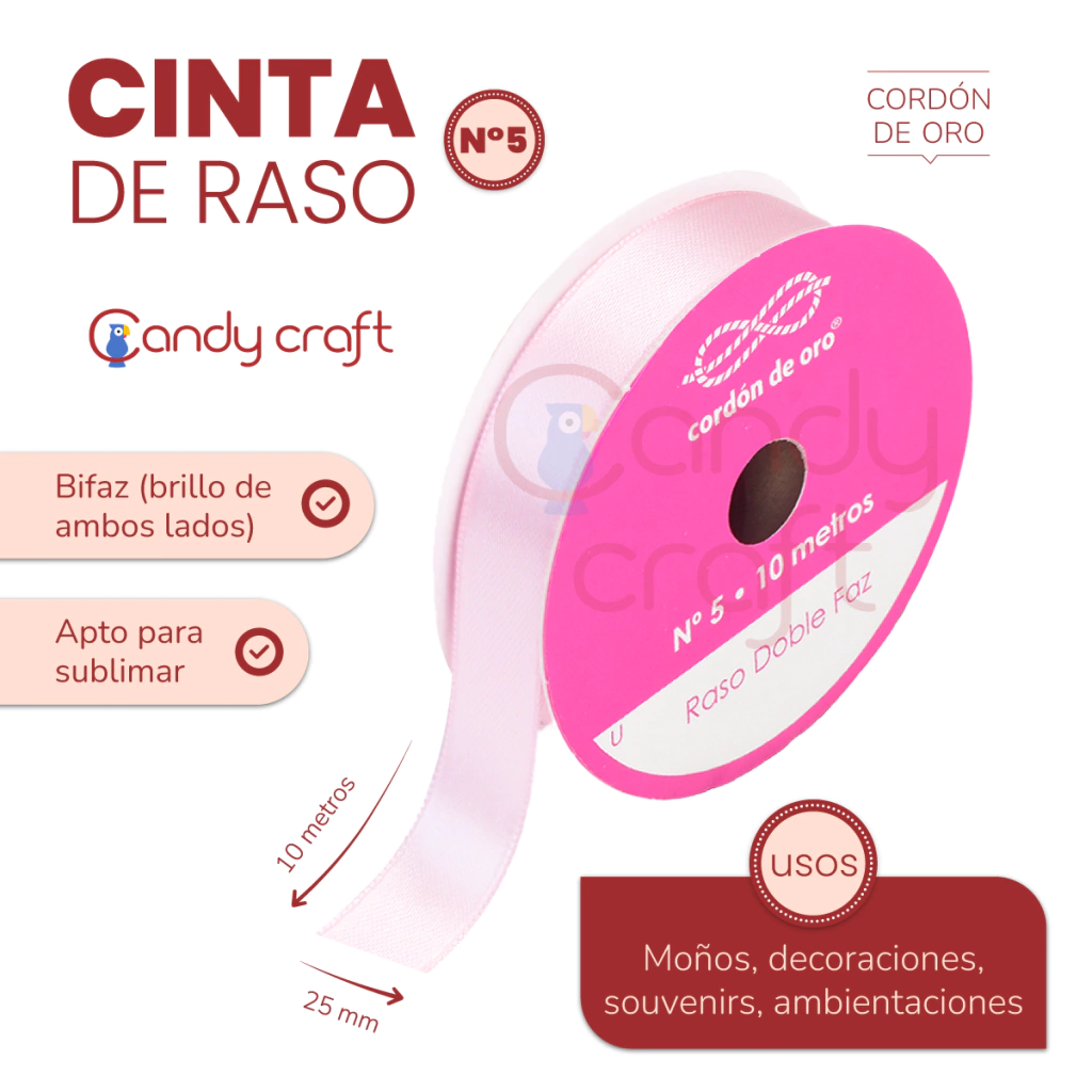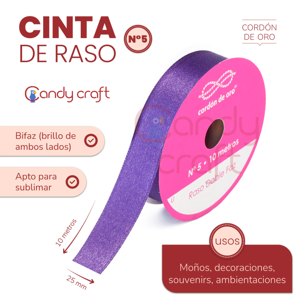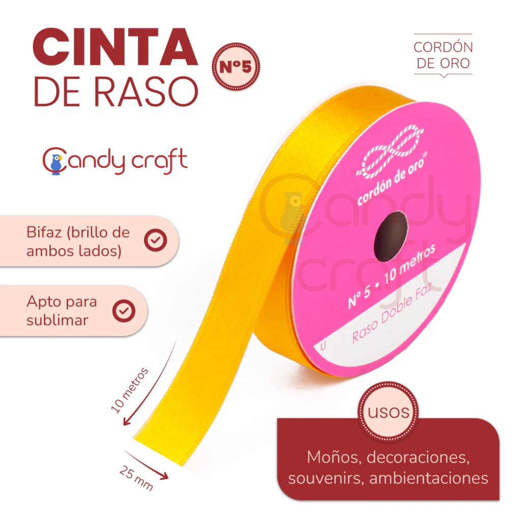 Medida Largo: 10 metros Ancho: 25 mm Marca: Cordón de Oro Material: Raso Uso: Souvenirs, Librería, Manualidades, Moños, Confección