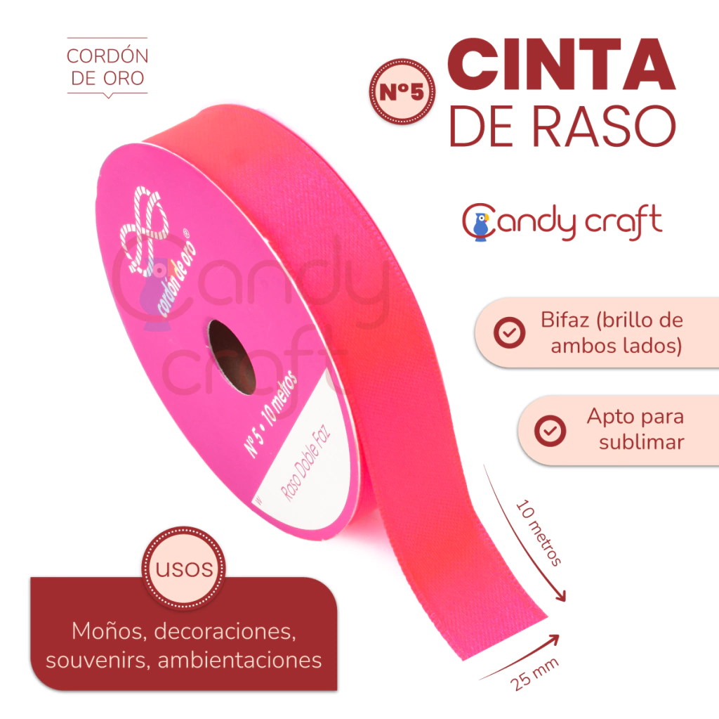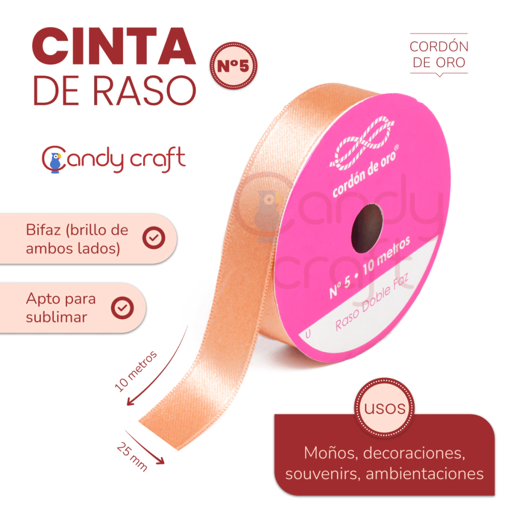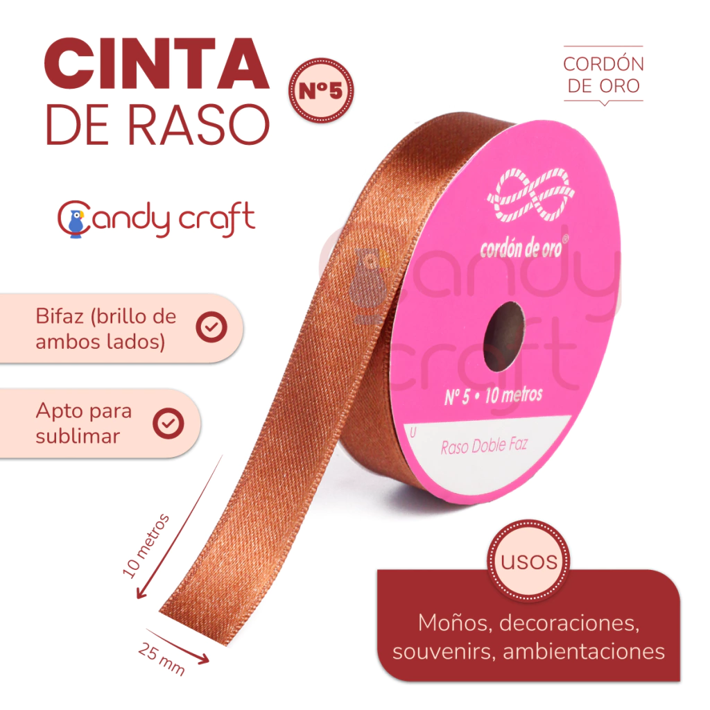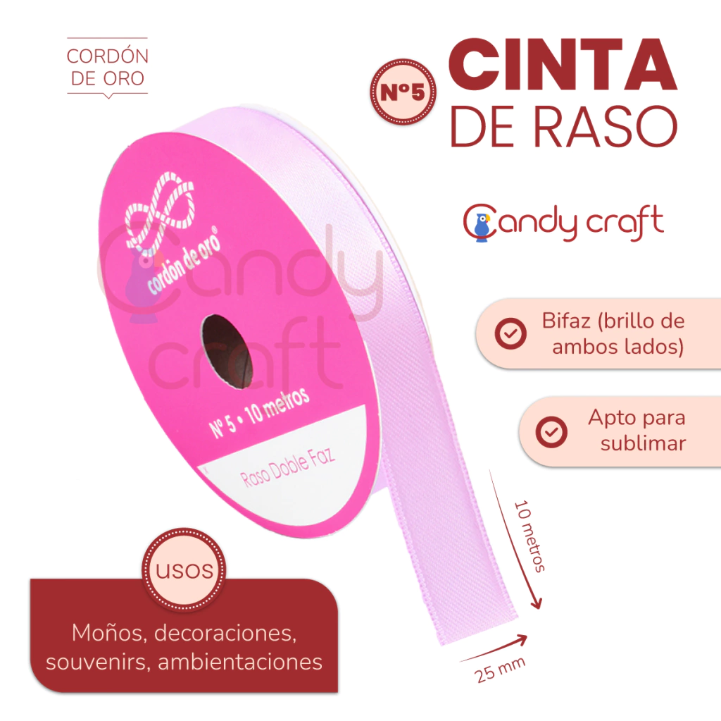 Medida Largo: 10 metros Ancho: 25 mm Marca: Cordón de Oro Material: Raso Uso: Souvenirs, Librería, Manualidades, Moños, Confección