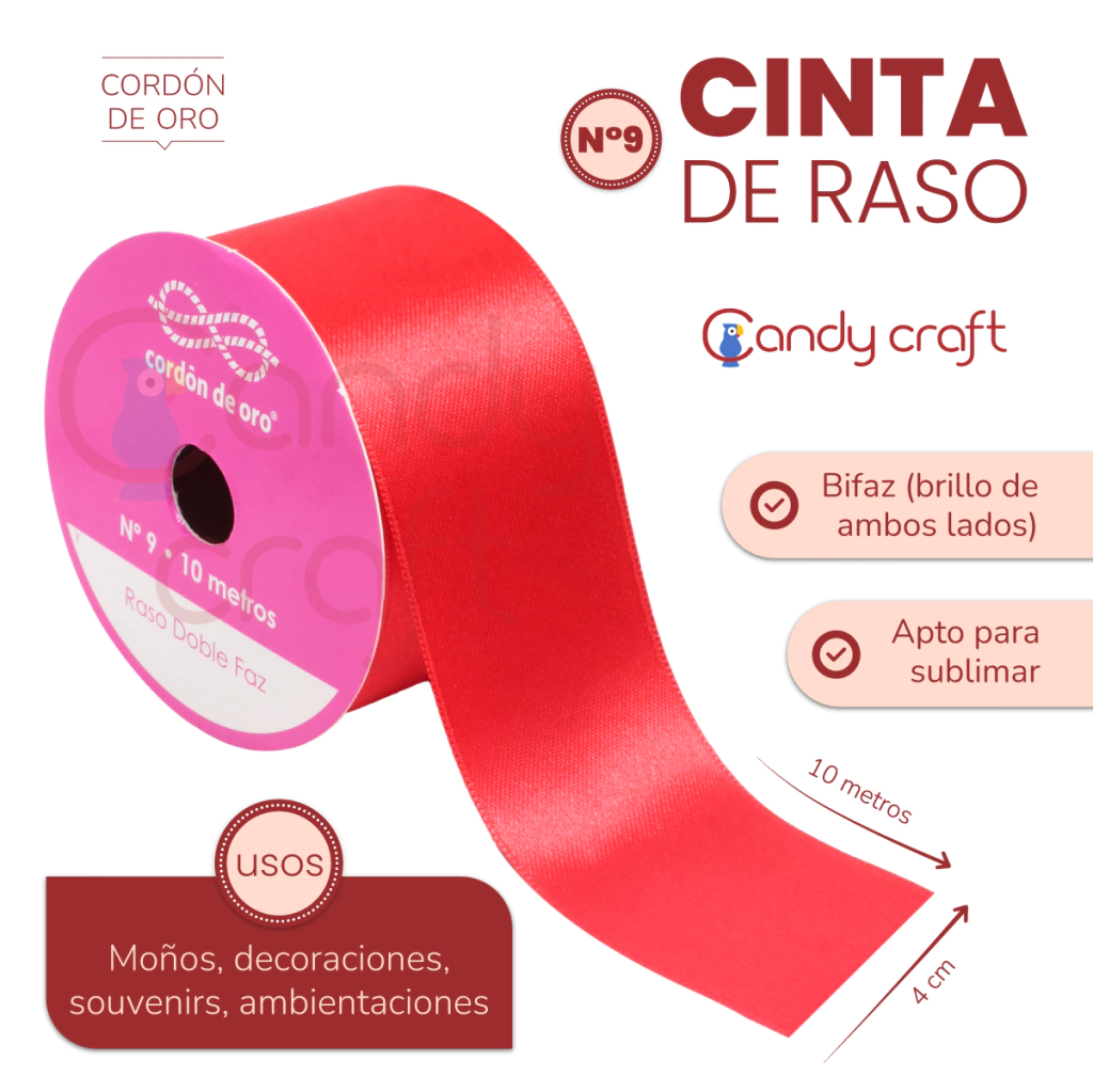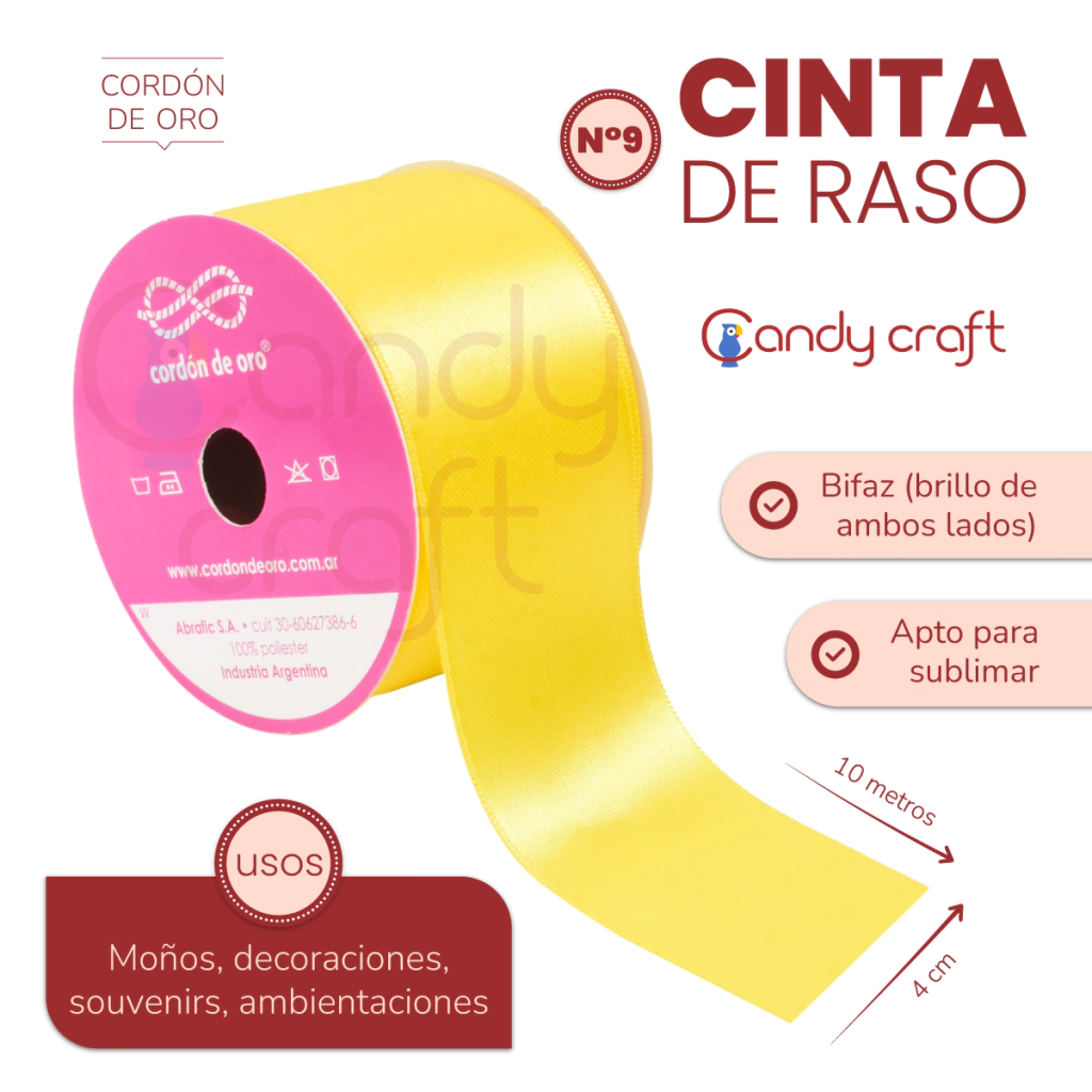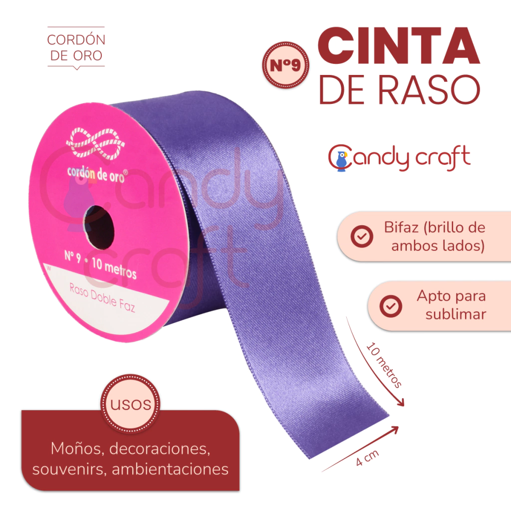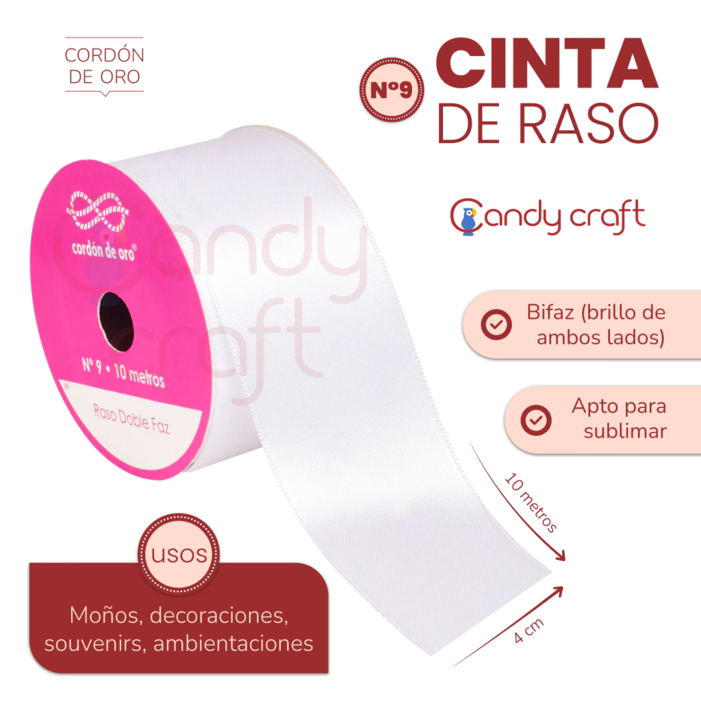 Medida Largo: 10 metros Ancho: 40 mm Marca: Cordón de Oro Material: Raso Uso: Souvenirs, Librería, Manualidades, Moños, Confección