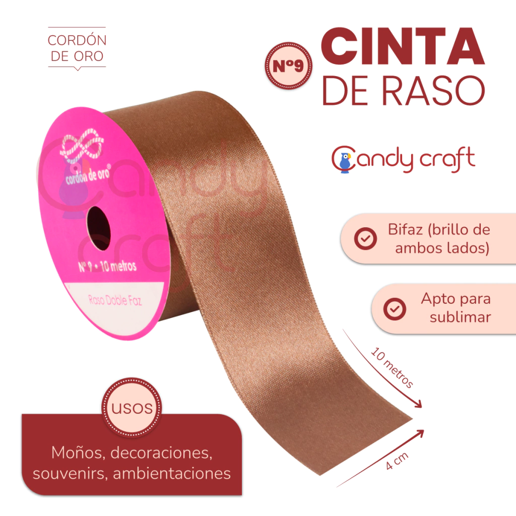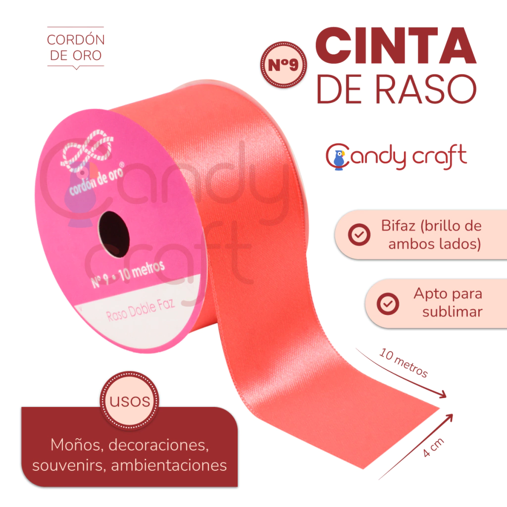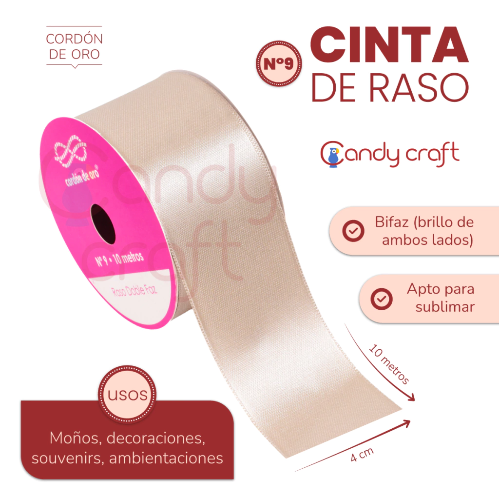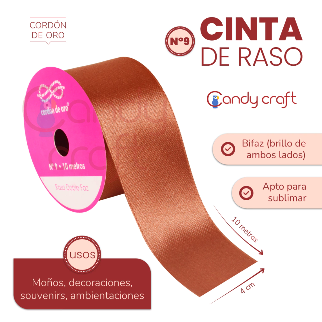 Medida Largo: 10 metros Ancho: 40 mm Marca: Cordón de Oro Material: Raso Uso: Souvenirs, Librería, Manualidades, Moños, Confección