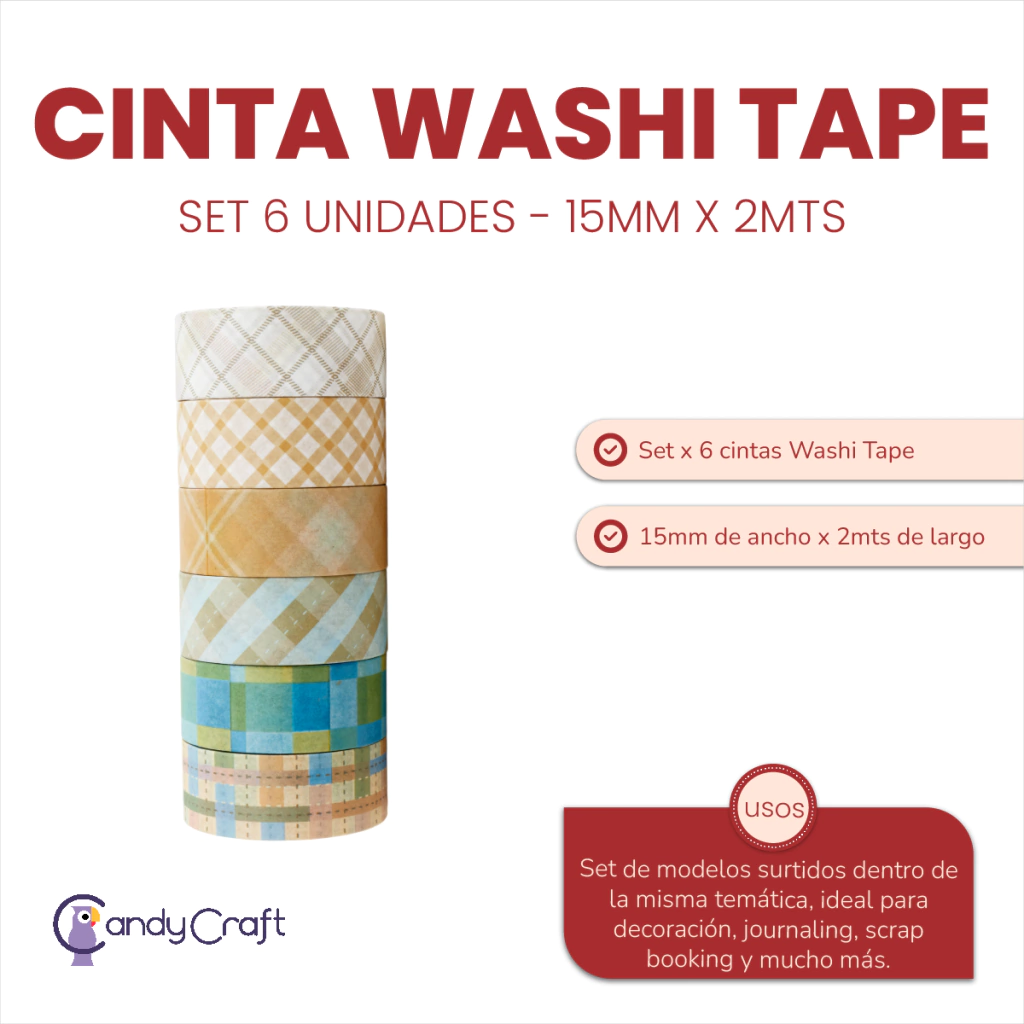 Set x 6 cintas washi tape 15mm de ancho x 2 metros de largo. Sets de modelitos surtidos dentro de una misma temática. Aclaración: el set Negro - Dorado viene con 4 cintas de 15mm y una cinta de 30mm. Uso: Decoración, journaling, scrap booking. Ideal para una actividad de cumpleaños, con amigos o para divertirse solo. Perfecto tanto para chicos como para grandes.