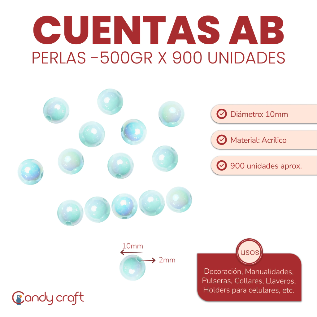 Diámetro: 10mm. Agujero: 2mm. Cantidad: 1 bolson de 500 gramos con aprox. 900 unidades. Material: Acrílico. Uso: Decoración, Manualidades, Pulseras, Collares, Llaveros, Holders de celular, etc.