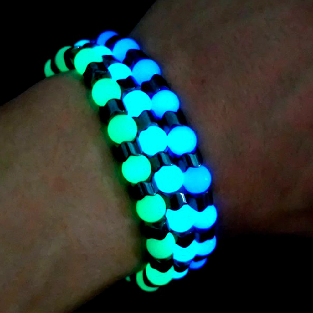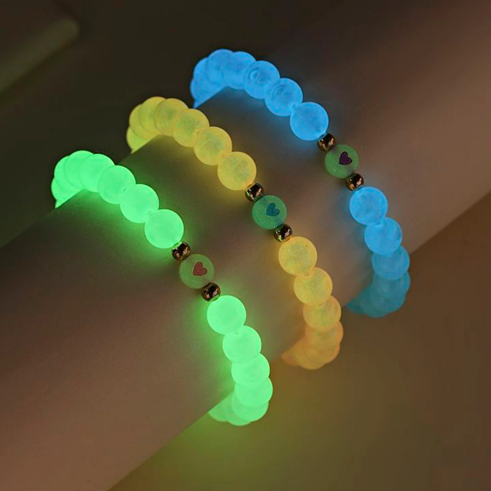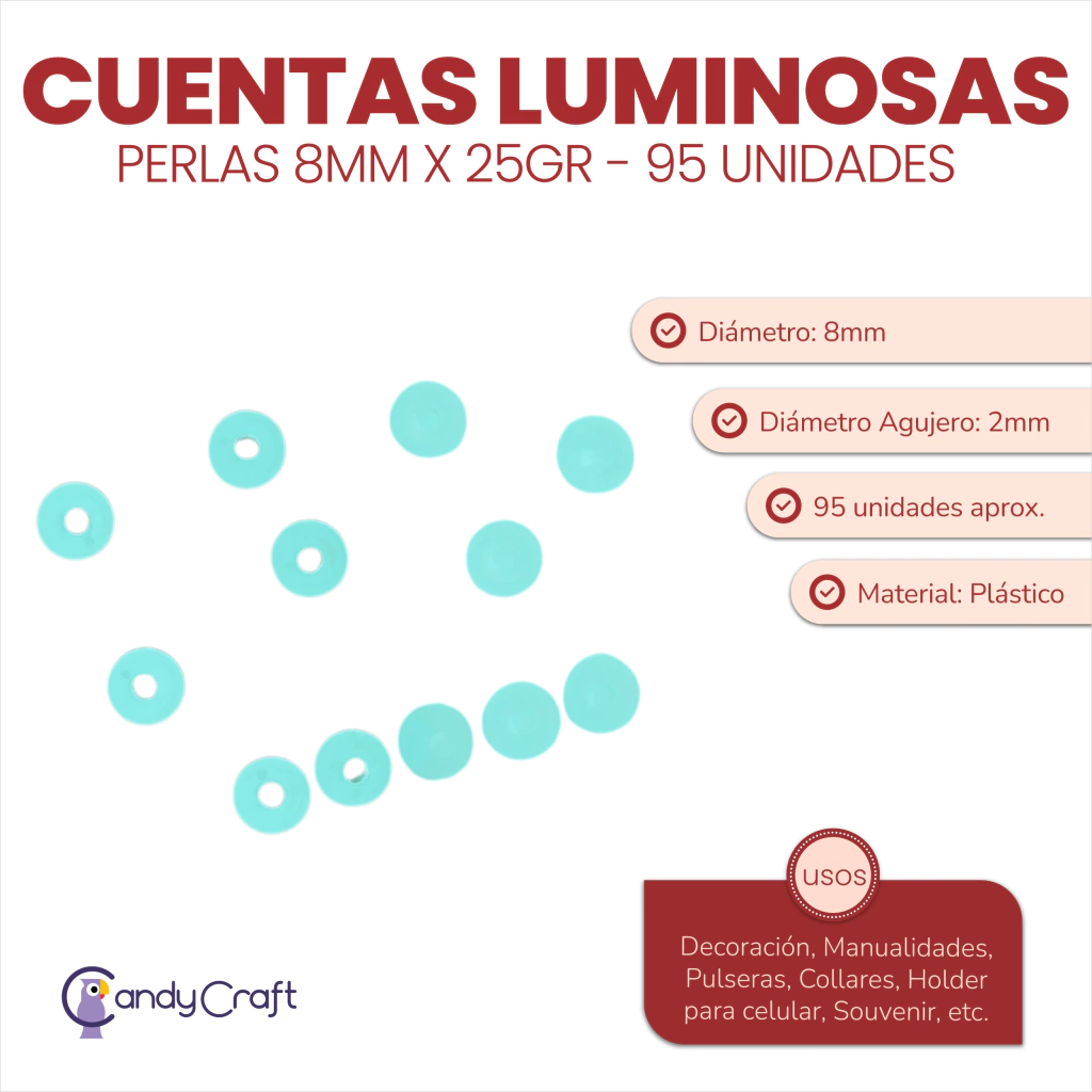 Diámetro: 8mm. Diámetro Agujero: 2mm. Cantidad: 1 paquetito de 25 gramos con aprox. 95 perlas. Material: Plastico. Estas cuentas luminosas brillan tanto en la oscuridad como con luz UV.  Uso: Decoración, Manualidades, Pulseras, Collares, Holder para el celular, Souvenirs, etc.