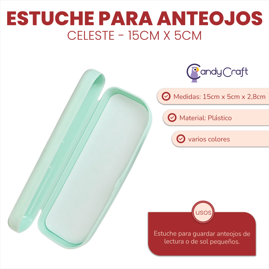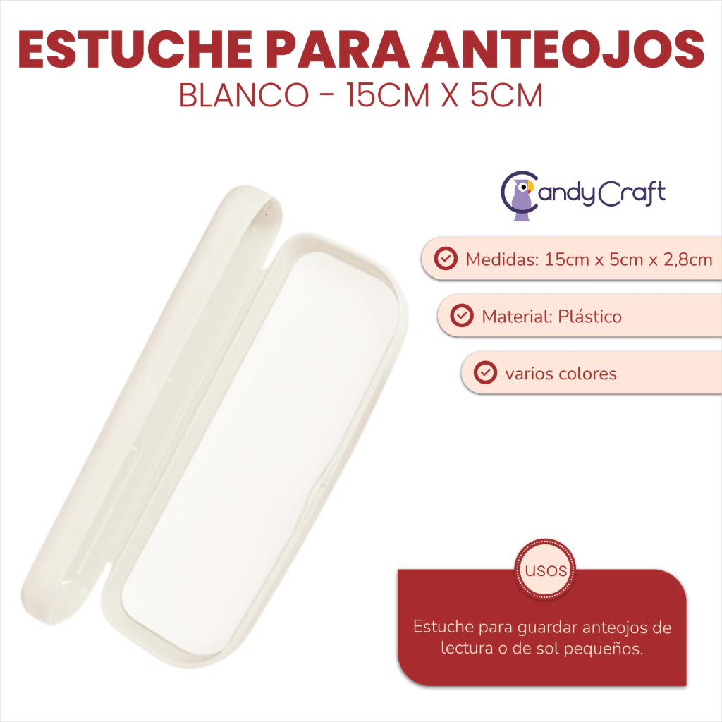 Largo: 15cm. Ancho: 5cm. Alto: 2,8cm. Material: Plástico.  Uso: Estuche para guardar anteojos de lectura o de sol pequeños.