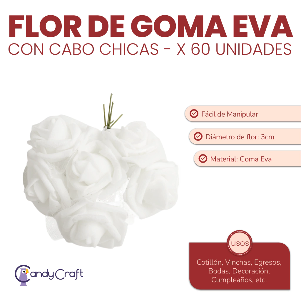 Medida Diámetro: 3 cm aprox. Material: Goma Eva. Cantidad: 1 paquete con 60 unidades del mismo color. Uso: Cotillón, Vinchas, Egresos, Bodas, Decoración, Cumpleaños, etc.