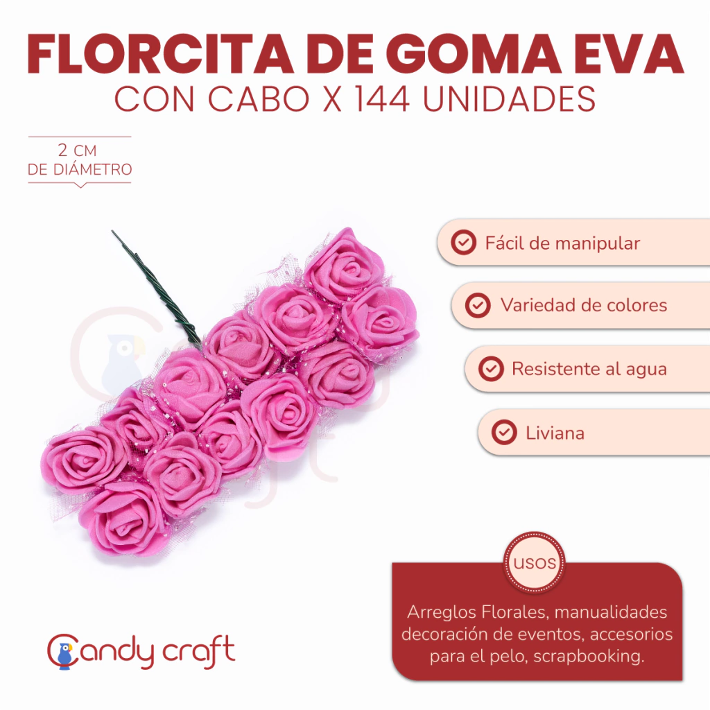Medida  Diámetro: 2 cm aprox Material: Goma Eva Cantidad: 1 paquete con 144 flores del mismo color. Uso: Cotillón, Vinchas, Egresos, Bodas, Decoración, Cumpleaños.