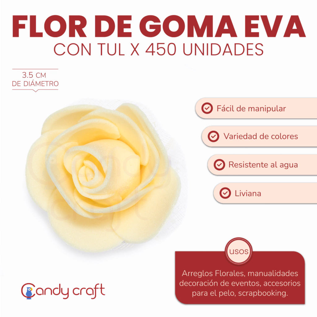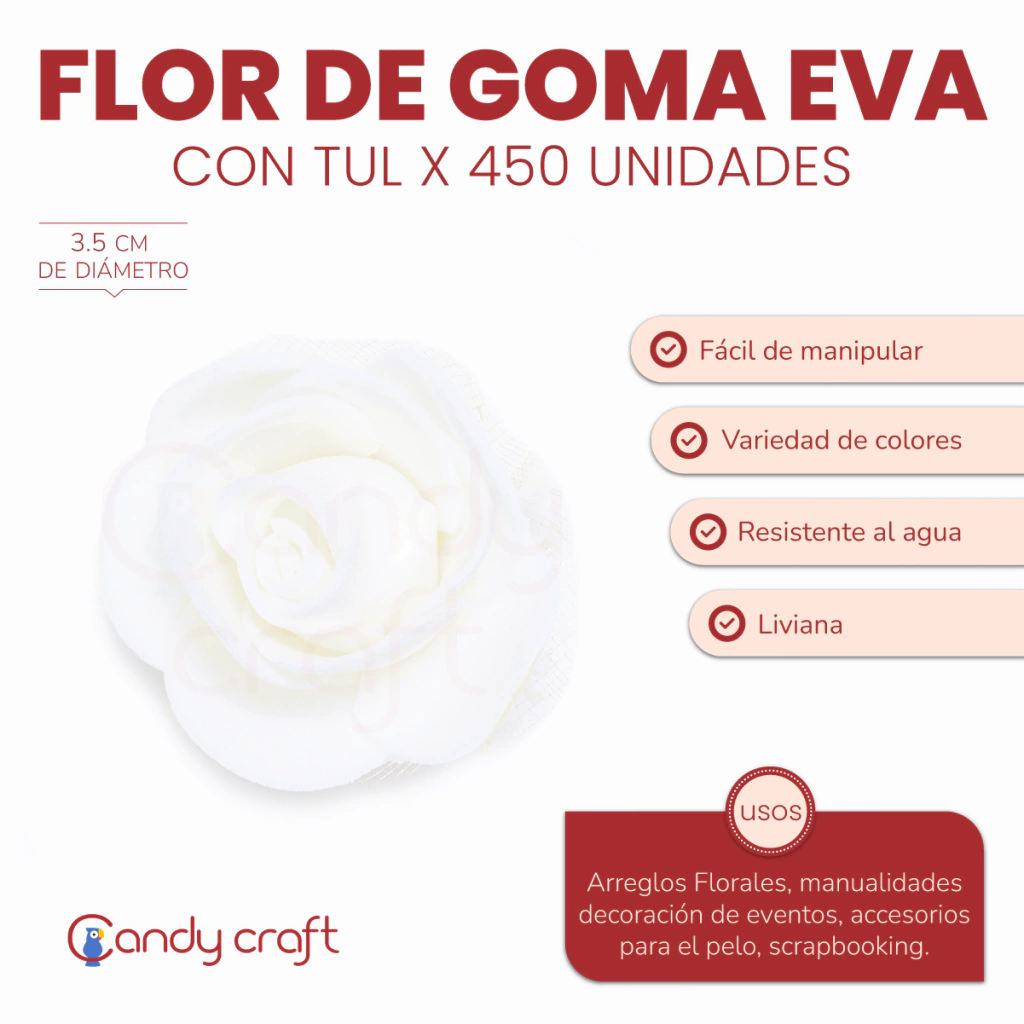 Medida  Diámetro: 3.5 cm aprox Material: Goma Eva con Tul Cantidad: 1 paquete con 450 unidades del mismo color Uso: Cotillón, Vinchas, Egresos, Bodas, Decoración, Cumpleaños, Confección