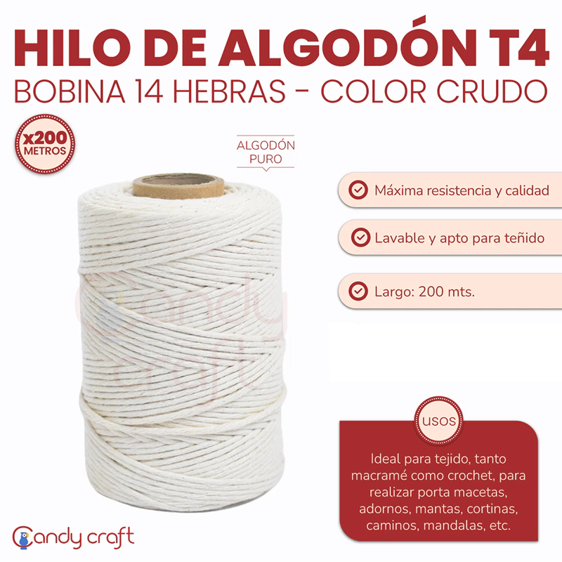Hilo de algodón puro, máxima resistencia y calidad. Color Crudo.