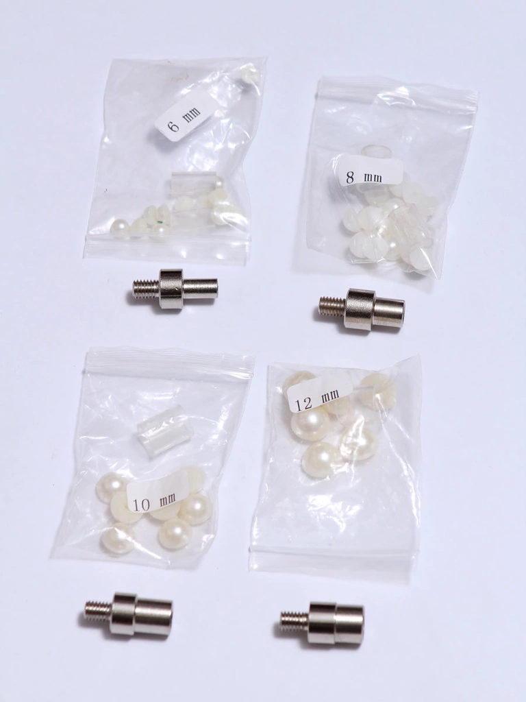 MATERIAL: Metal Incluye: La caja incluye matrices de 6/8/10/12mm para aplicar media perla. Además incluye matrices para tachas de 8/10mm. Uso: Las piezas se aplican mediante el uso de presión con la ayuda de una clavija que se inserta debajo de la pieza.