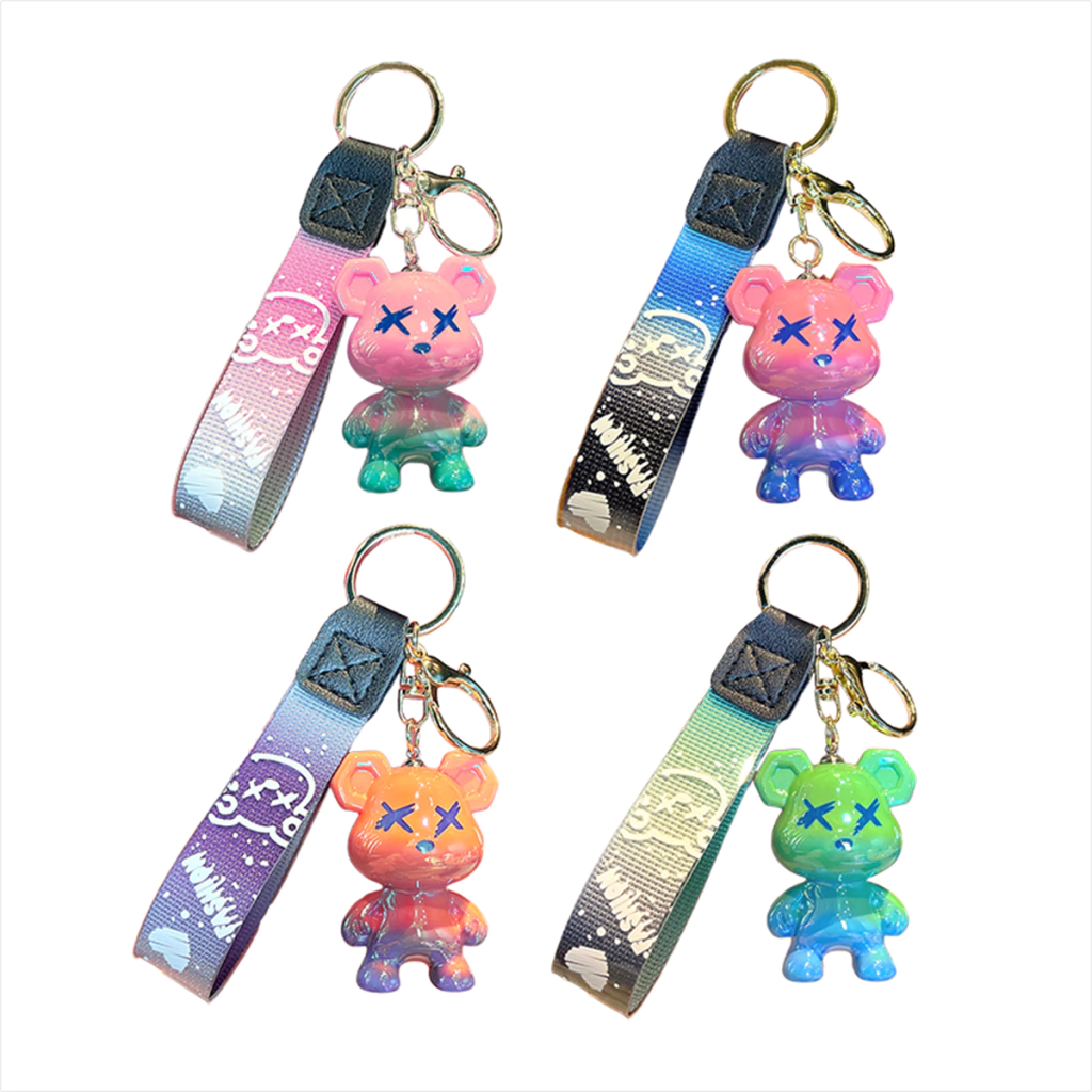 Medida largo total: 17cm. Medida oso: 5,5cm x 4cm. Material: Oso de plástico rígido, correa de tela. Díametro argolla: 3cm. Diámetro mosqueton: 2cm. Uso: Llavero, Decoración de carteras o mochilas, etc. Ideal para Souvenirs o Regalos.