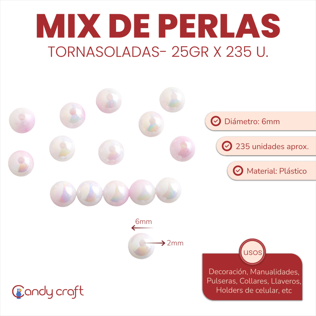 Mix de perlas tornasolada, los tonos dentro de cada paquetito varían. Diámetro: 6mm. Cantidad: 1 paquete de 25gr con aprox. 235 unidades. Material: Acrílico. Uso: Decoración, Manualidades, Pulseras, Collares, Llaveros, Holders de celular, etc.