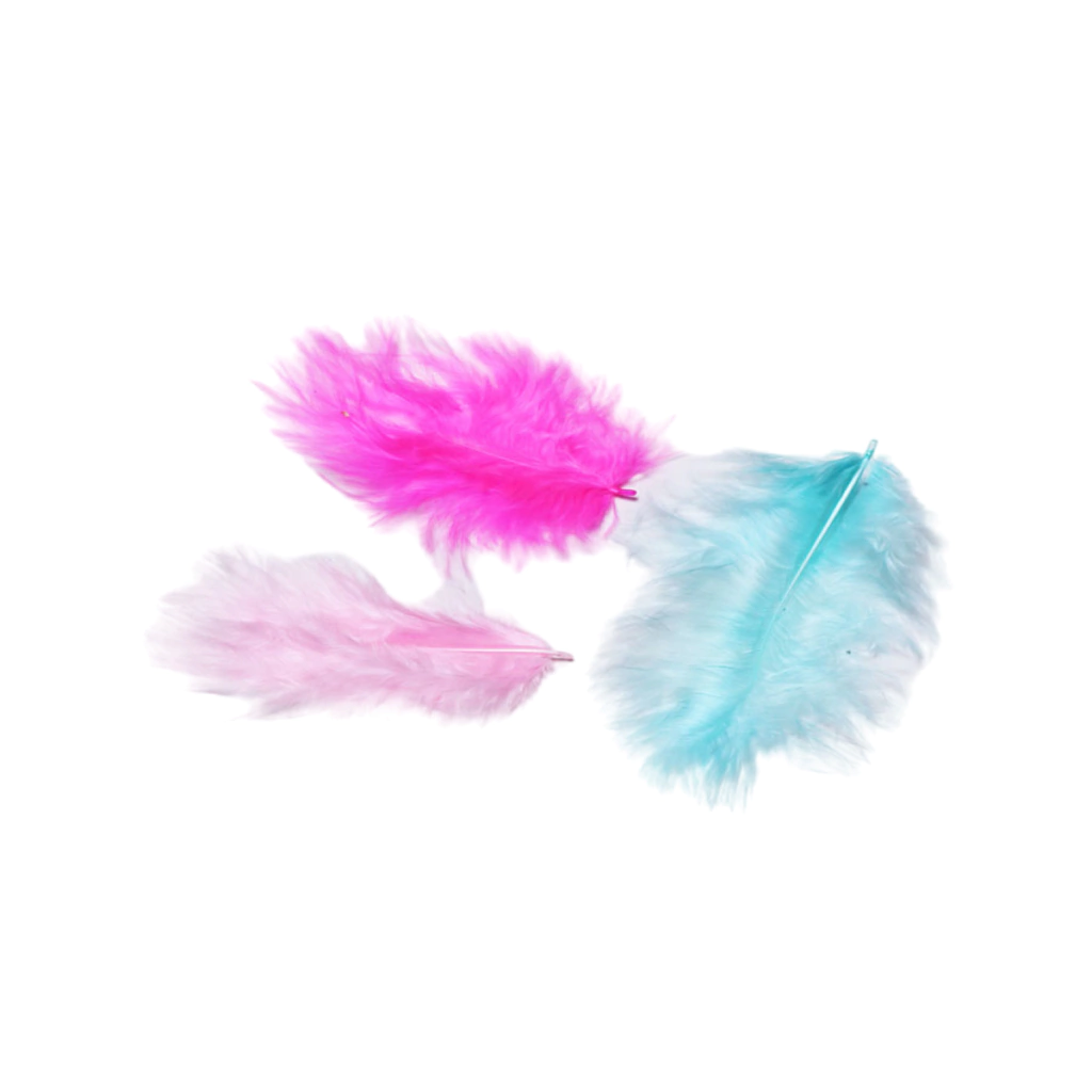 Medida Alto: 7 cm. Ancho: 4 cm. Cantidad: 1 Bolsa con 100 plumas Material:  pluma de Marabú Uso: Regalería, Cumpleaños, Souvenirs, Decoración de eventos, Bodas, Disfraces, llamador de angeles.