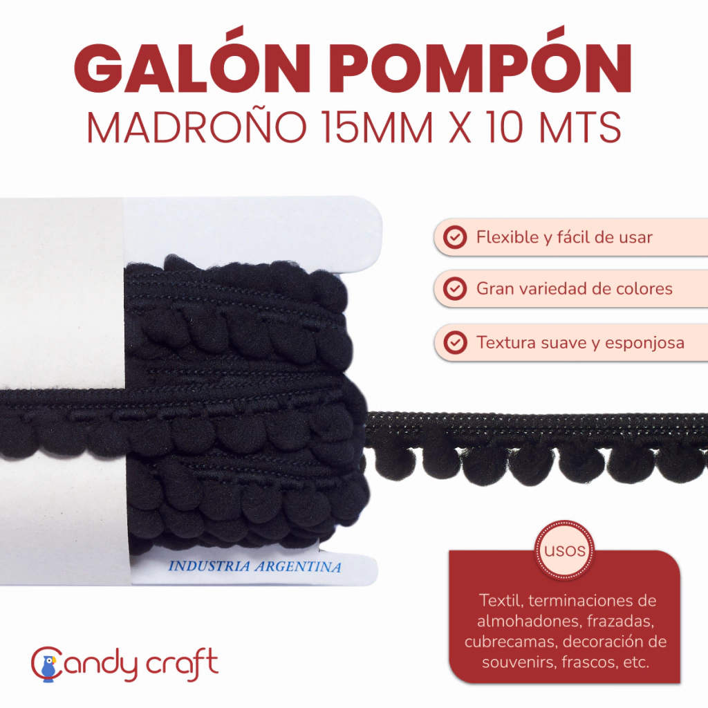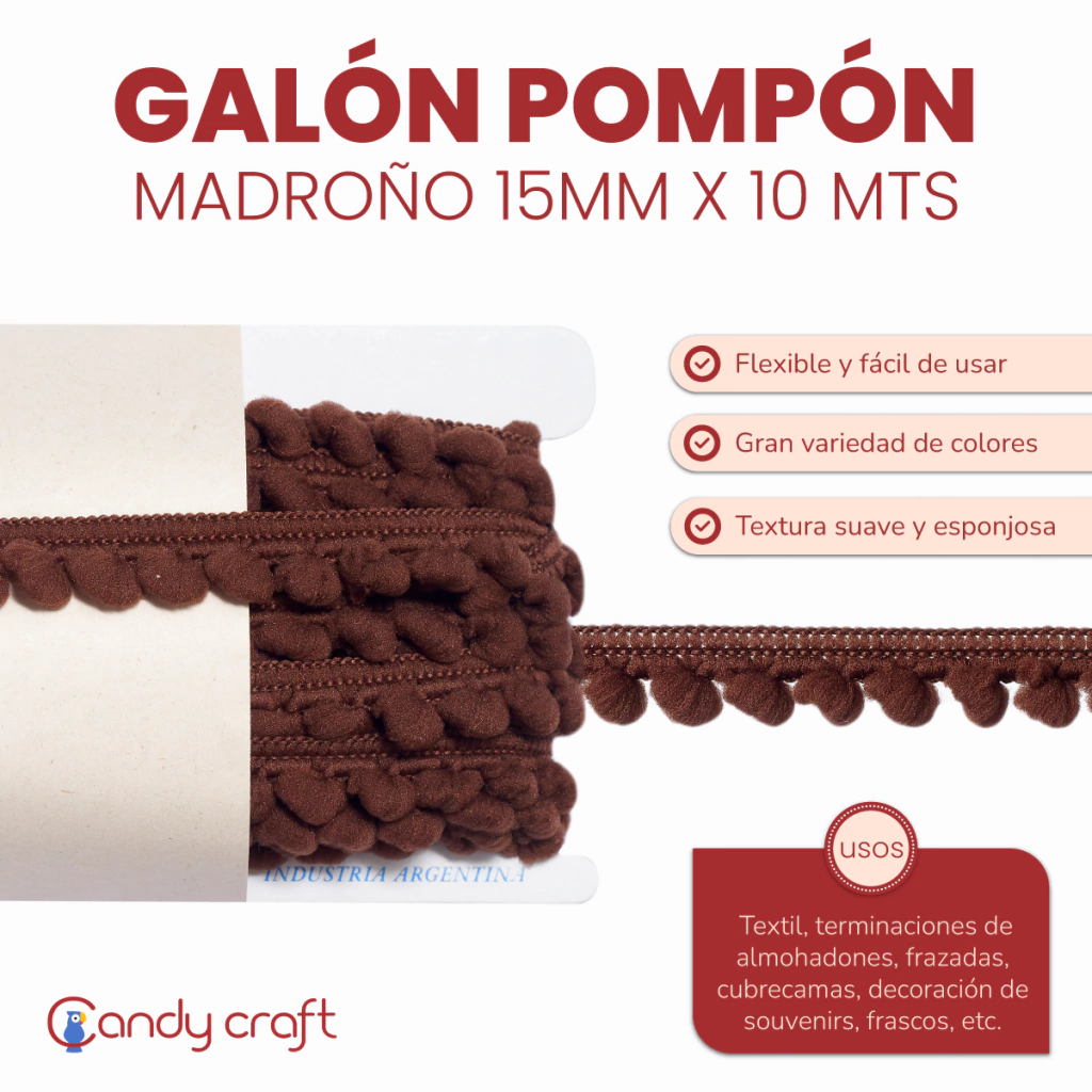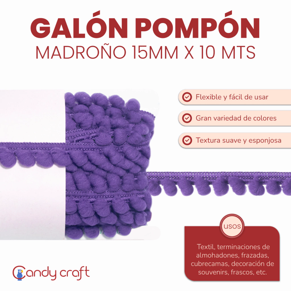 Usos: Textil, terminaciones de almohadones, frazadas, cubrecama, cortinados, etc. Decoración de souvenirs, candybar, frascos, etc.