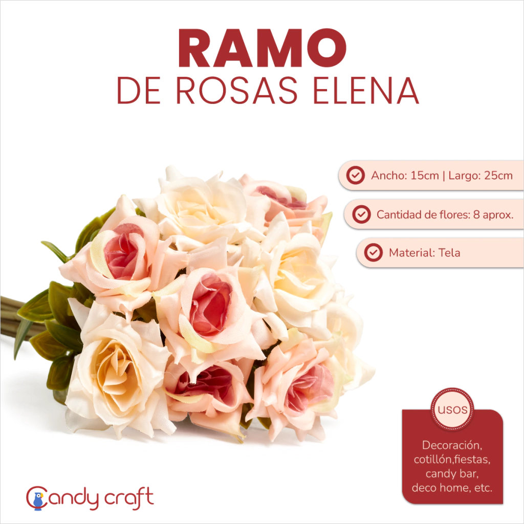 Medida Largo: 25 cm Ancho: 15  cm Cantidad de flores: 8 aprox Medida de flores: 4 cm aprox Material: Tela Uso: Decoración, Ramo para armar, Fiestas, Ramo de Novia