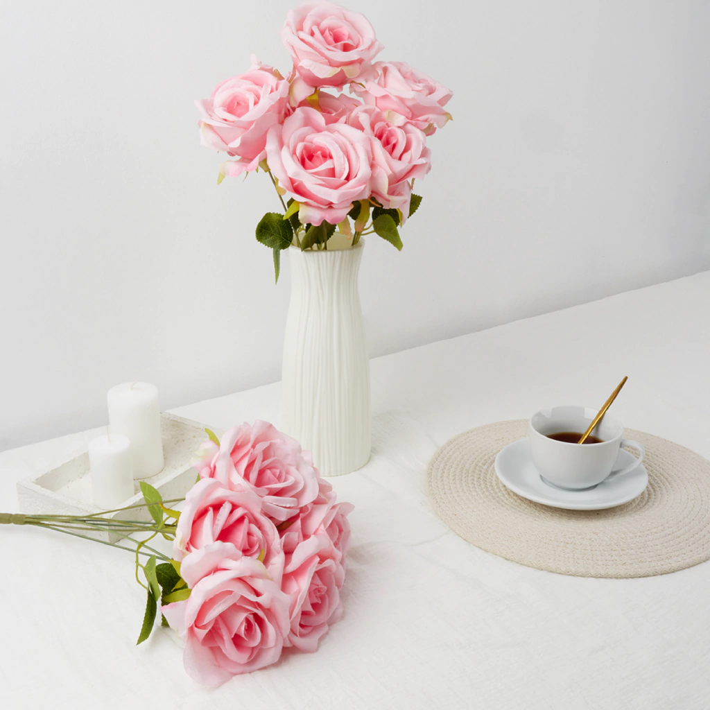 Alto: 43cm. Ancho: 20cm. Cantidad de flores por ramo: aprox. 7 flores. Medidas de la flor: 8cm de diámetro x 7cm de alto. Material: Flores y hojas de tela, tallo plástico. Cada ramita tiene una sola rosa y se unen en un tallo en común al final. Algunas ramas tienen hojas y otras no. Medida hojas: 5,5cm alto x 3cm ancho. Usos: Centro de mesa, Decoración de Fiestas, Lobbys de Hotel, Hogar, etc.