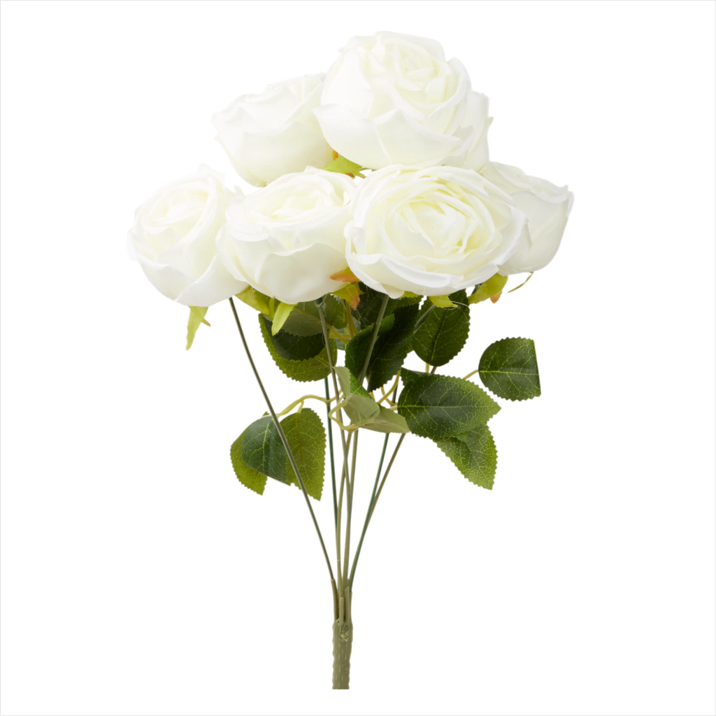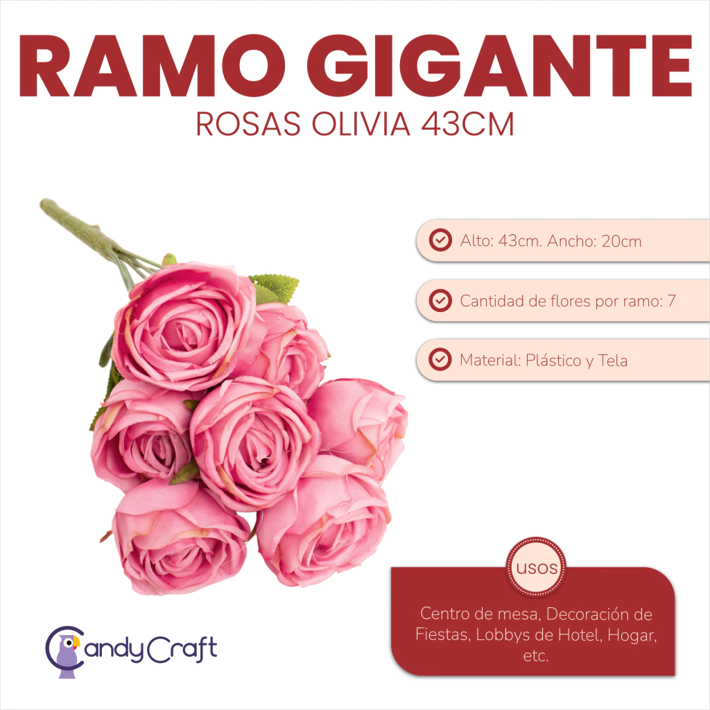 Alto: 43cm. Ancho: 20cm. Cantidad de flores por ramo: aprox. 7 flores. Medidas de la flor: 7cm de diámetro x 5cm de alto. Material: Flores y hojas de tela, tallo de plástico. Cada ramita tiene una sola rosa y se unen en un tallo en común al final. Medida hojas: 5,5cm alto x 3cm ancho. Usos: Centro de mesa, Decoración de Fiestas, Lobbys de Hotel, Hogar, etc.