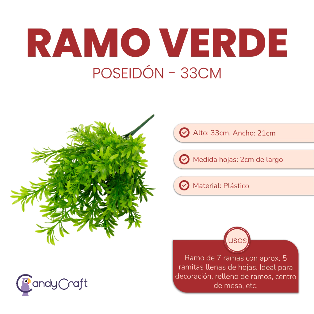Alto: 33cm. Ancho: 21cm. Medida hojas: 2cm de largo. Material: Plástico. Ramo de 7 ramas con aporx. 5 ramitas llenas de hojas cada una. Usos: Decoración, relleno de ramos, Centro de mesa, Decoración, etc.