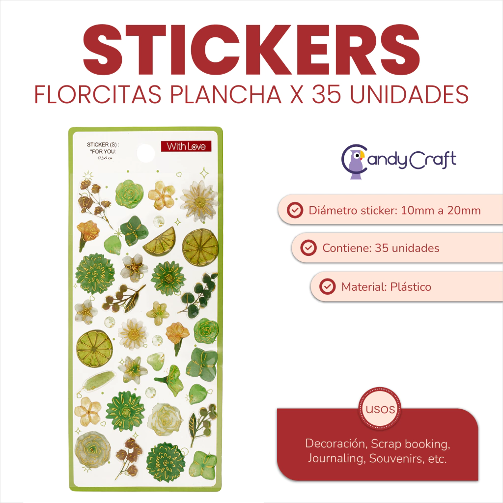 Diámetro stickers: de 10mm a 20mm. Cantidad por plancha: 35 unidades. Sticker autoadhesivo con un pequeño relieve. Material: Plástico. Uso: Decoración, Scrap booking, Journaling, Souvenirs, etc.