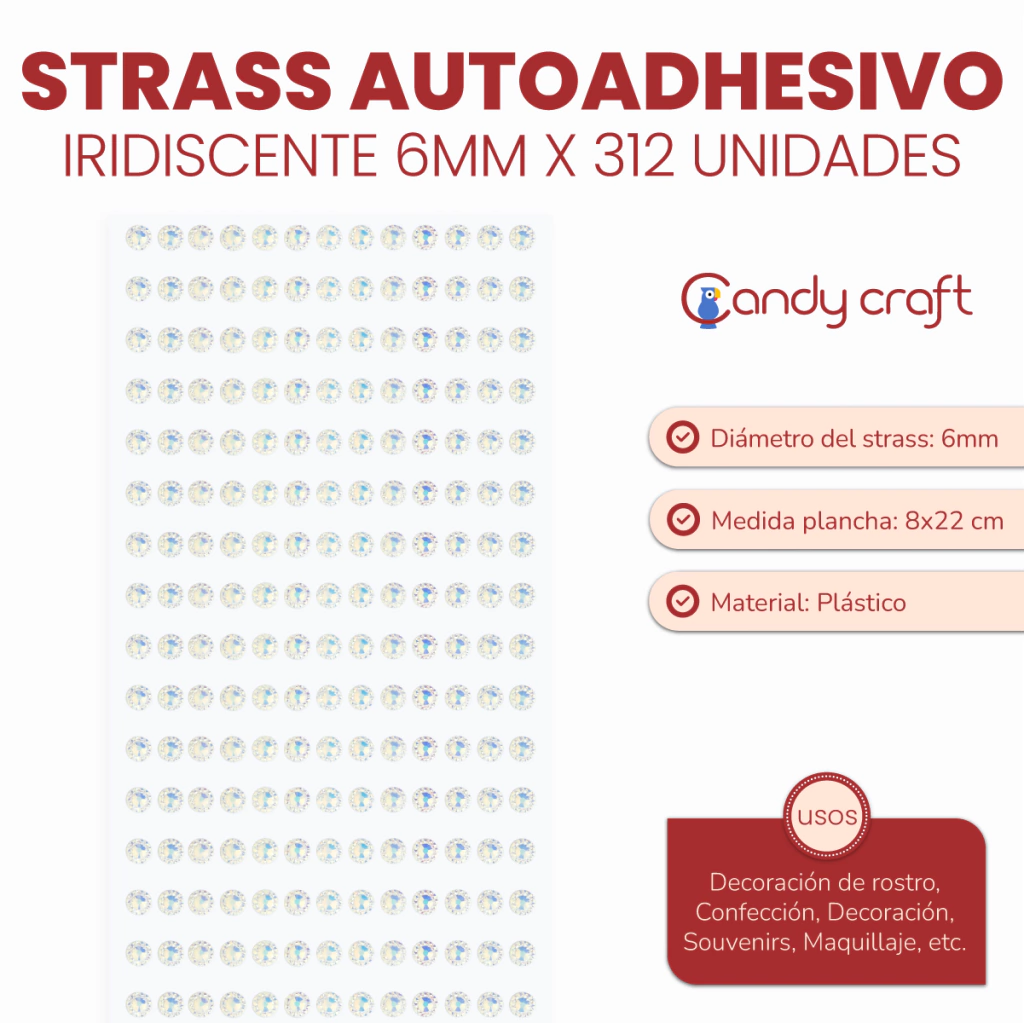 Medida Diámetro: 6 mm. Cantidad por plancha: 312 unidades. Plancha: Largo 23 cm, Ancho 8.5 cm. Material: Plástico Uso: Confección, Decoración, Souvenirs