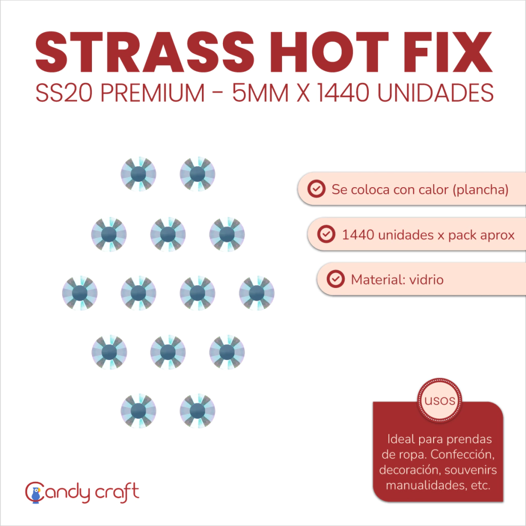 Medida: 5mm/SS20 Cantidad: 1 paquete con 1440 unidades Material: Vidrio Colocación: Calor (plancha o lapíz aplicador) Uso: Confección, Decoración, Manualidades