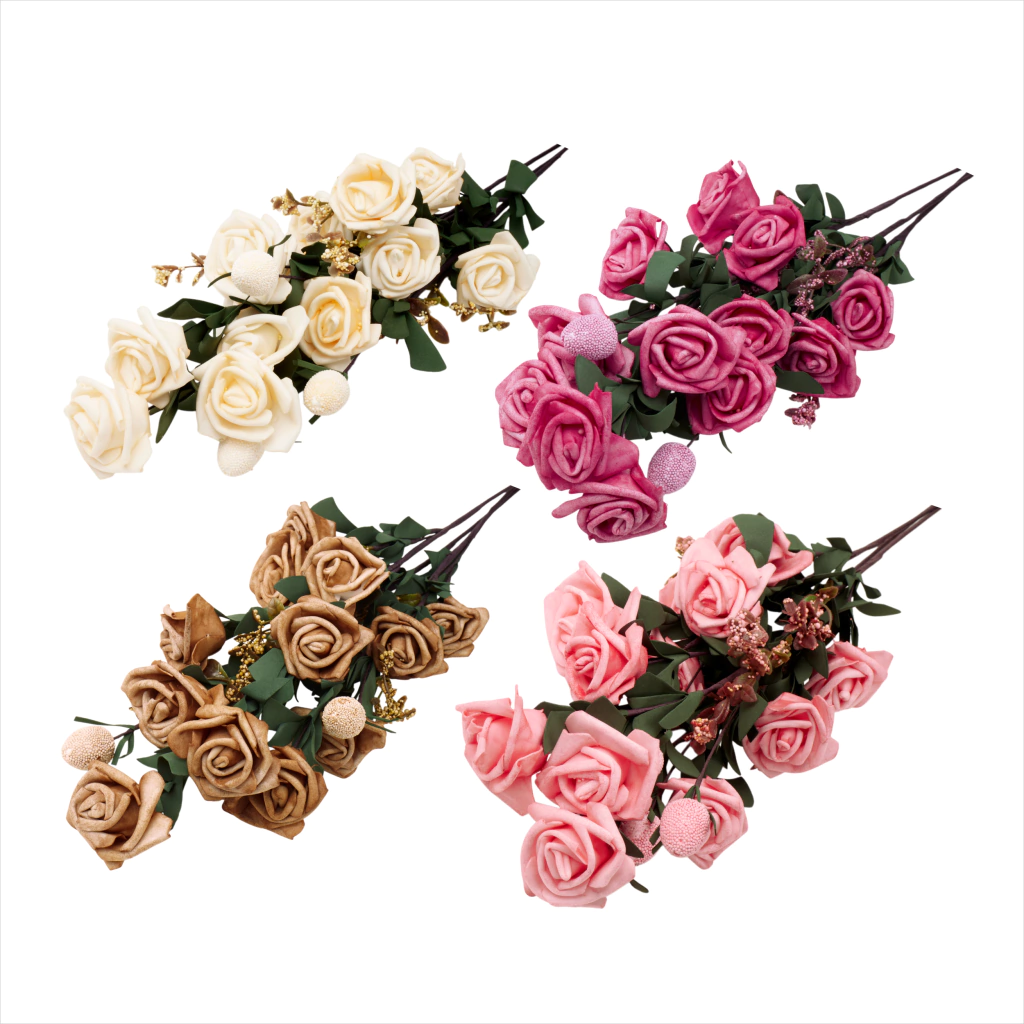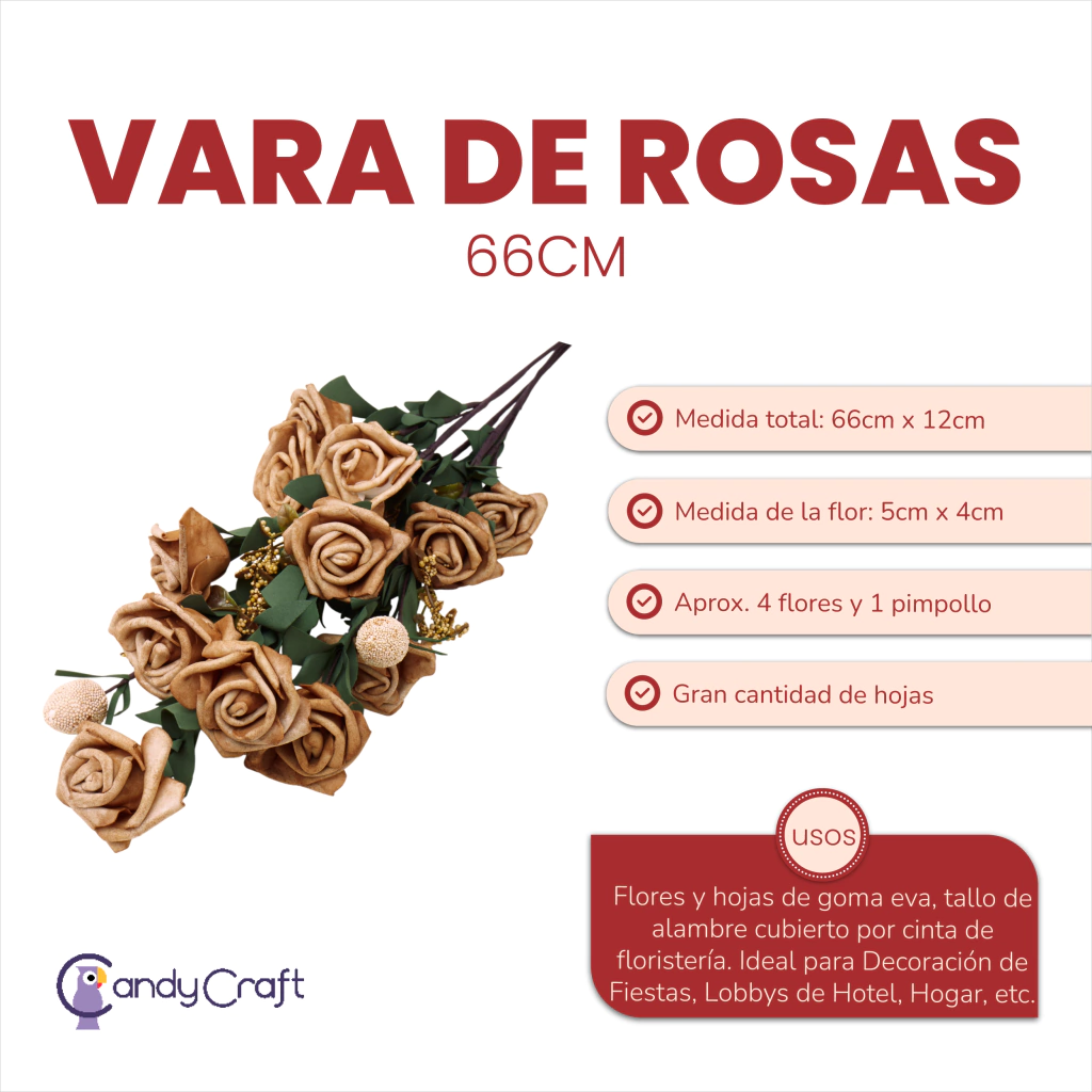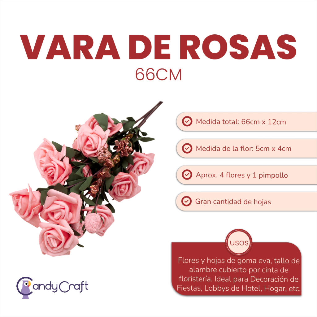 Alto: 66cm. Ancho: 12cm. Cantidad de flores por vara: aprox. 4 flores abiertas y 1 pimpollo de tergopol. Gran cantidad de hojas. Medida de la flor: 5cm de diámetro x 4cm de alto. Material: Flores y hojas de goma eva, tallo de alambre cubierto por cinta de floristería. Usos: Centro de mesa, Decoración de Fiestas, Lobbys de Hotel, Hogar, etc.