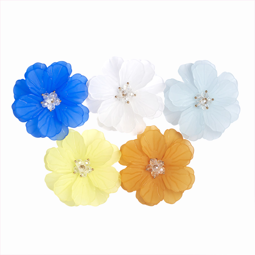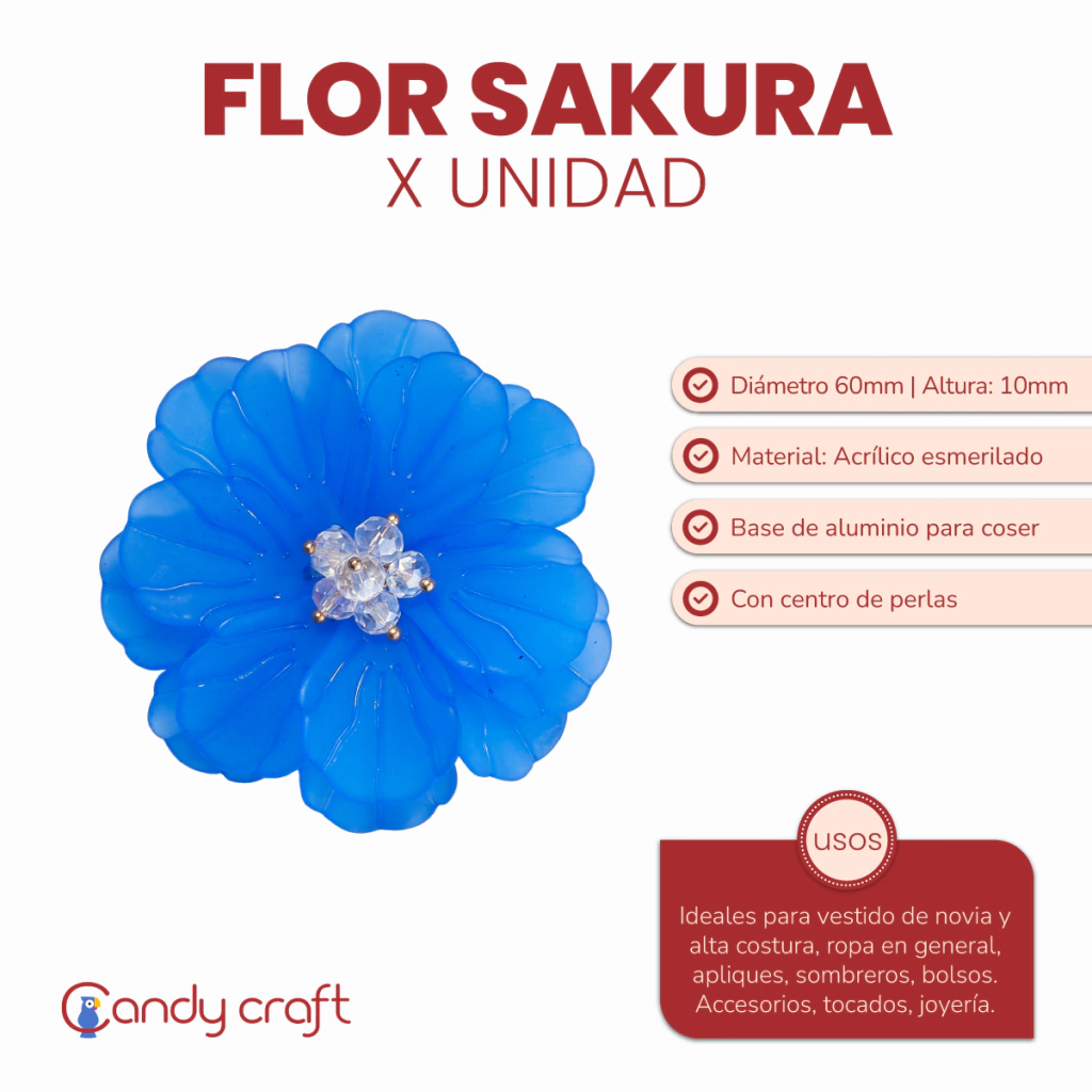 Diametro 60mm Altura 10mm. Flor de Acrilico esmerilada, simil opalina (doble capa de petalos) con centro de perlas facetadas. Detalles de pequeñas perlitas doradas con Base de aluminio para poder coser. Ideal para vestido de novia y alta costura; ropa en general, apliques, zapatos, sombreros, bolsos, accesorios, tocados y joyeria.