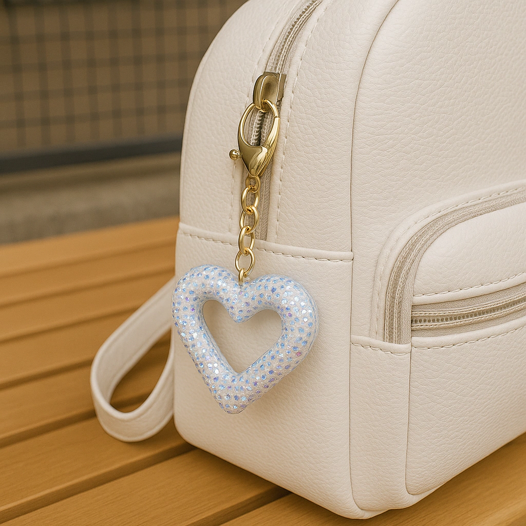 Medida largo total: 10cm. Medida corazón: 6cm x 5cm. Díametro argolla: 3cm. Diámetro mosqueton: 2cm. Material: Mini strass. Uso: Llavero, Decoración de carteras o mochilas, etc. Ideal para Souvenirs o Regalos.