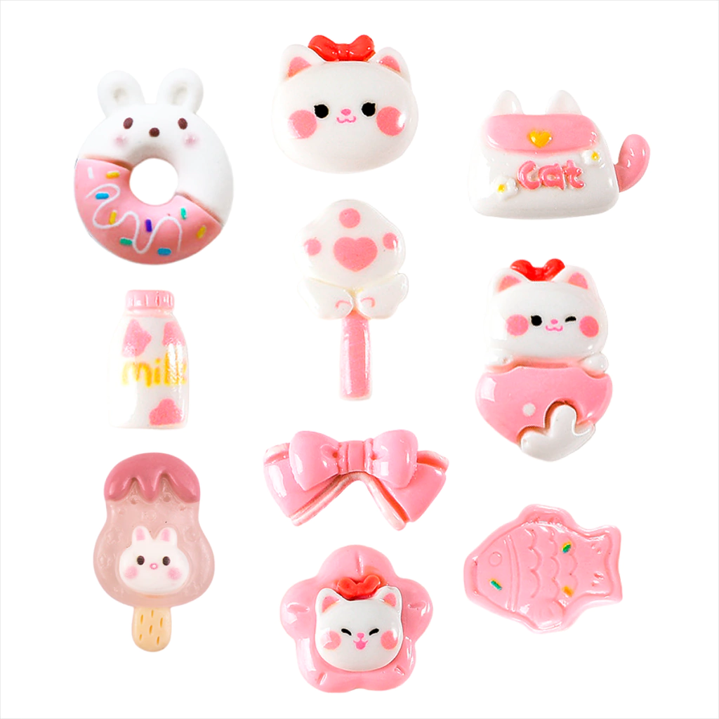 Aplique de resina resistente, ideal para decoración. Cantidad: 10 unidades de modelos surtidos en misma temática. Medidas: aproximandamente de 12 a 20 milímetros de diámetro, dependiendo del modelo. Usos: Decoración de mesas dulces, candy bar, souvenirs, centro de mesa, vinchas, hebillas, fundas de teléfono, etc