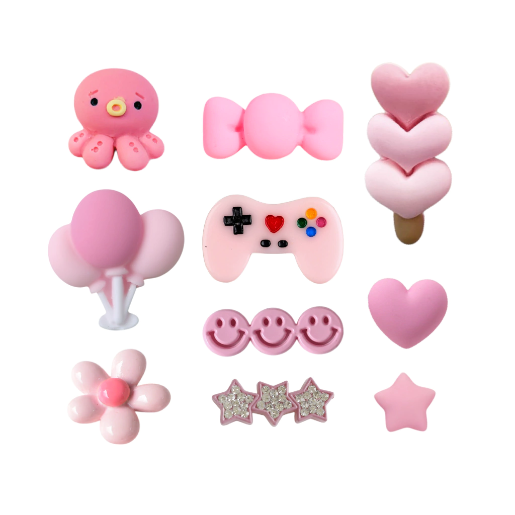 Pack de apliques surtidos en distintos motivos, misma paleta crómatica metalizada. Medida: aprox de 1,5cm a 3cm cada uno. Cantidad: 10 unidades en misma paleta cromática. Pueden variar los modelos. Usos: Decoración de mesas dulces, candy bar, souvenirs, centro de mesa, vinchas, hebillas, fundas de teléfono, etc.