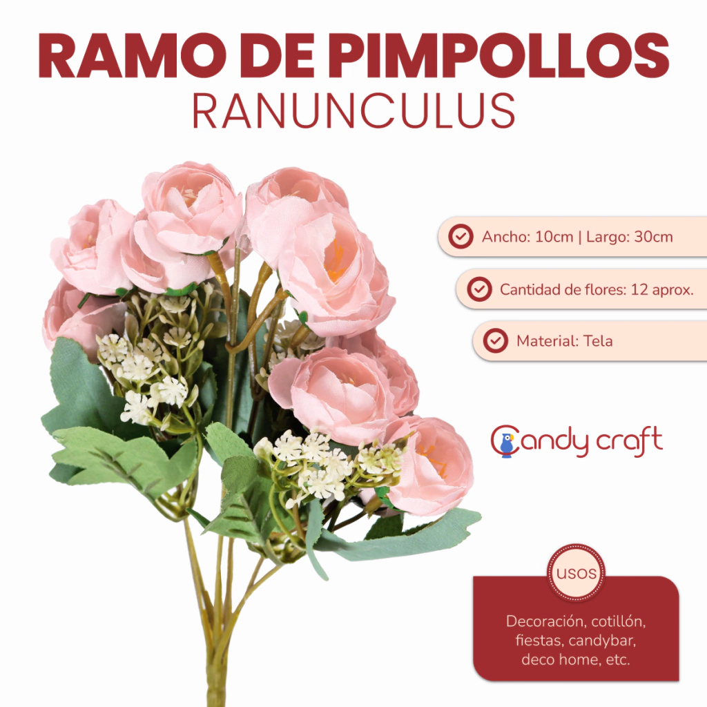 Medida Largo: 30 cm Ancho: 10  cm Cantidad de flores: 12 aprox Medida de flores: 2.5 cm aprox Material: Tela Uso: Decoración, Ramo para armar, Fiestas, Ramo de Novia